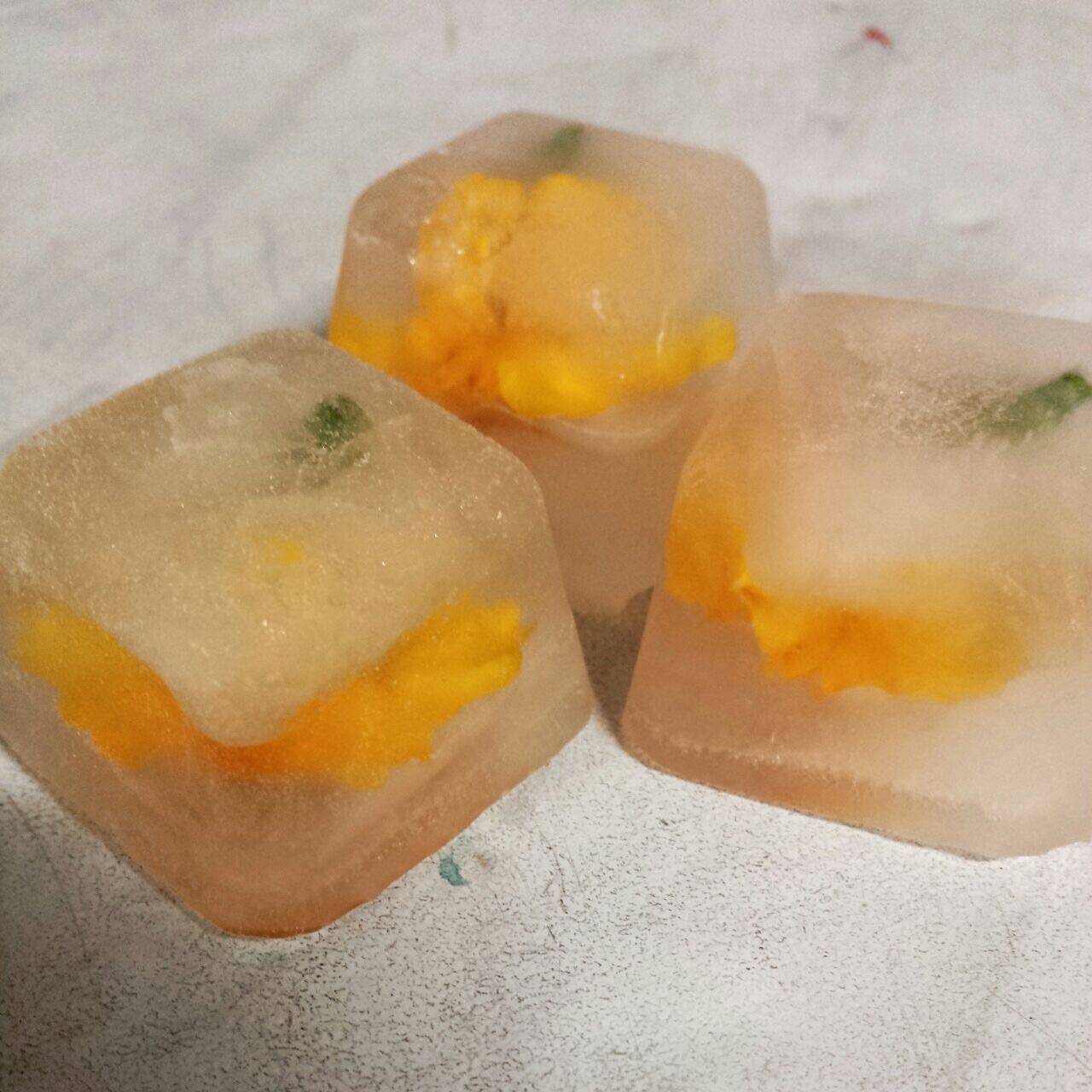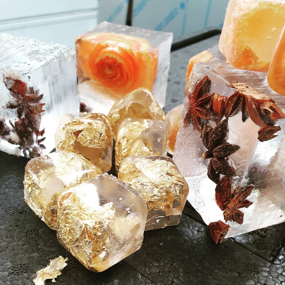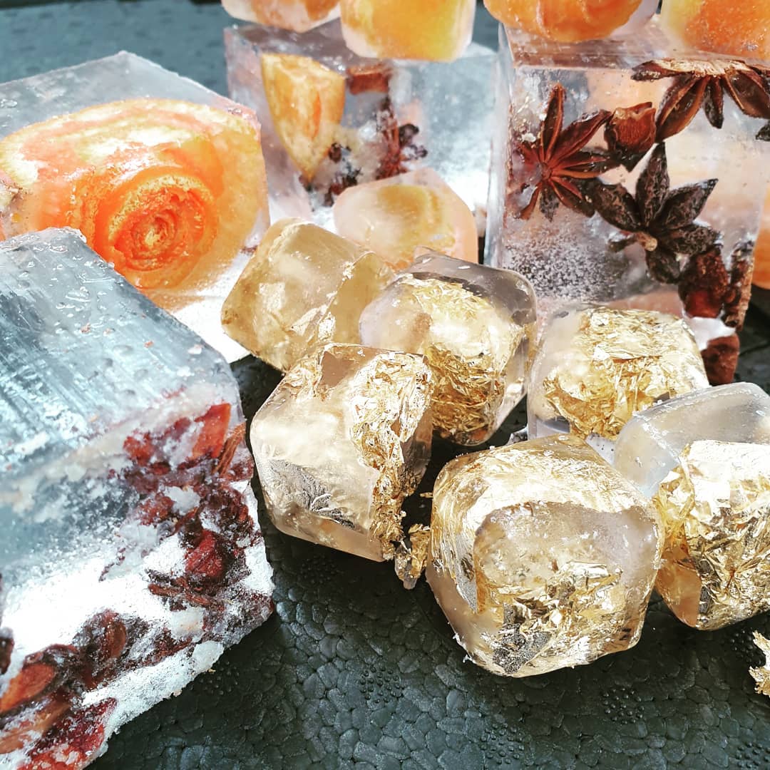 Abbiamo a disposizione ghiaccio in differenti forme con all'interno frutta, botaniche ed fiori edibili per decorare i cubetti e renderli più scenografici. E' possibile anche aggiungere glitter alimentari per dare un tocco di colore in più ai drink.